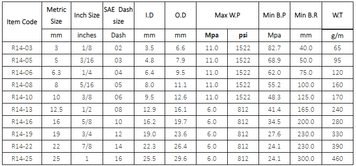 PTFE hose (SAE100 R14) TEMPERATURE RANGE: -73℃ (-164 ℉ ) to +260℃(+500 ℉)