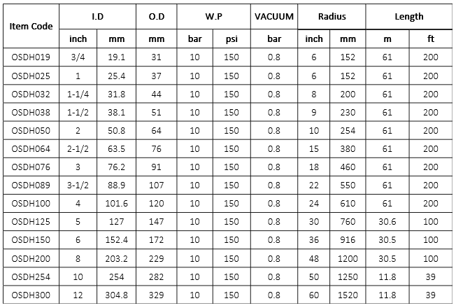 Reinforcement: Multi plies high strength synthetic fabric and steel wire helix skeleton.
